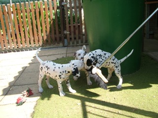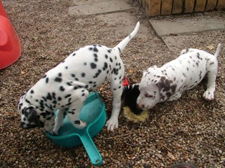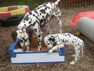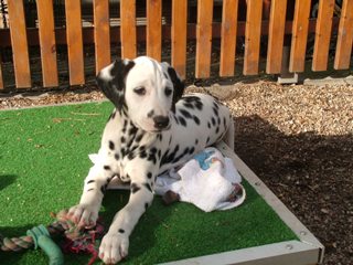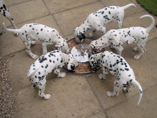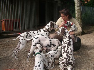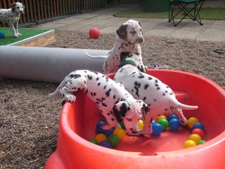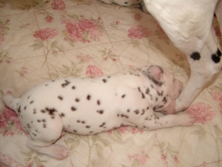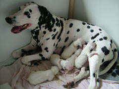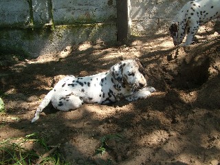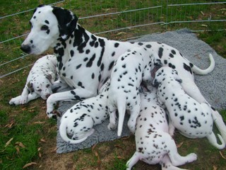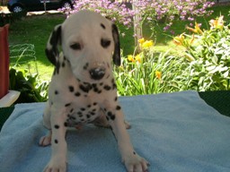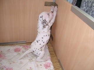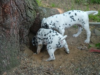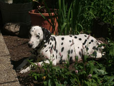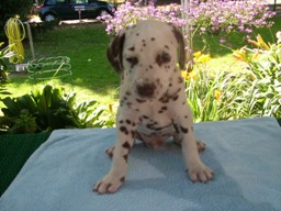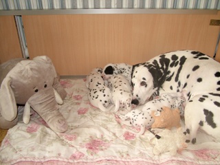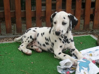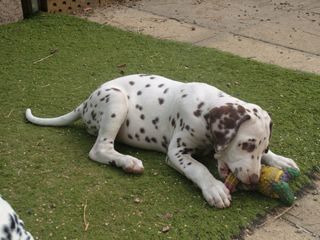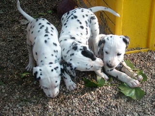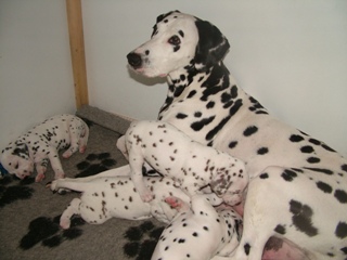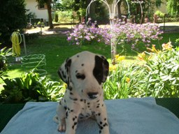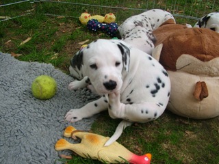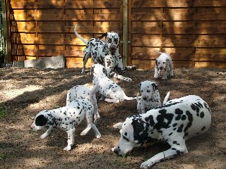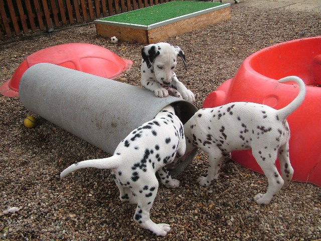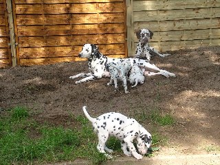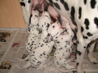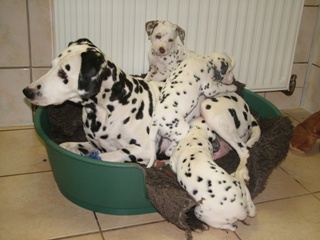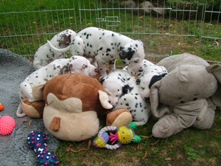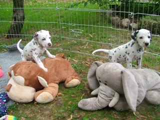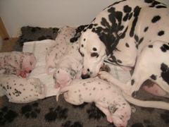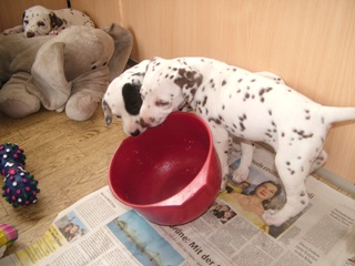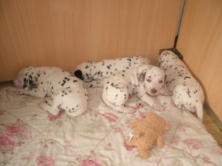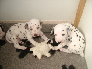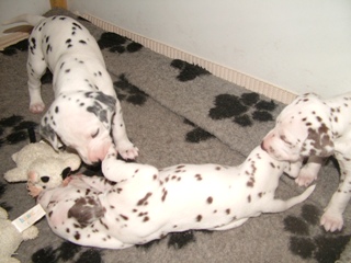 | Auch die 5. Woche ist vorbei und es hat sich wieder so Einiges getan. Wir haben gelernt, dass Welpenfutter doch ganz gut schmeckt, dass man Schnürsenkel öffnen kann und Zeitungspapier und andere „Utensilien“ sind das beste und interessanteste Spielzeug. Am liebsten schlafen wir auf dem „Dumbo“ (ein Plüsch-Elefant) und zu seiner Verstärkung kam nun auch noch „Charly“ (ein Plüsch-Affe) dazu, wir mussten wieder die „olle Wurmkur“ schlucken und halten natürlich Mama „Penny“ und Frauchen voll auf Trapp. Zum Ende der 5. Woche sind wir nun in unser „Außenrevier“ gezogen und fühlen uns dort „dalmiwohl“. Unser Appetit hat sich natürlich vergrößert und vom Toben und spielen sind wir dann auch müde und schlafen schon ganz schön lange. Mama „Penny“ ist bei uns und Tante „Ubella“ beschäftigt uns mit Toben und Spielen. Besucher hatten wir natürlich auch und somit gab es wieder viele, viele zusätzliche Streicheleinheiten. |