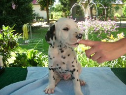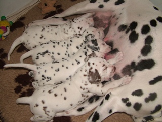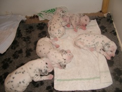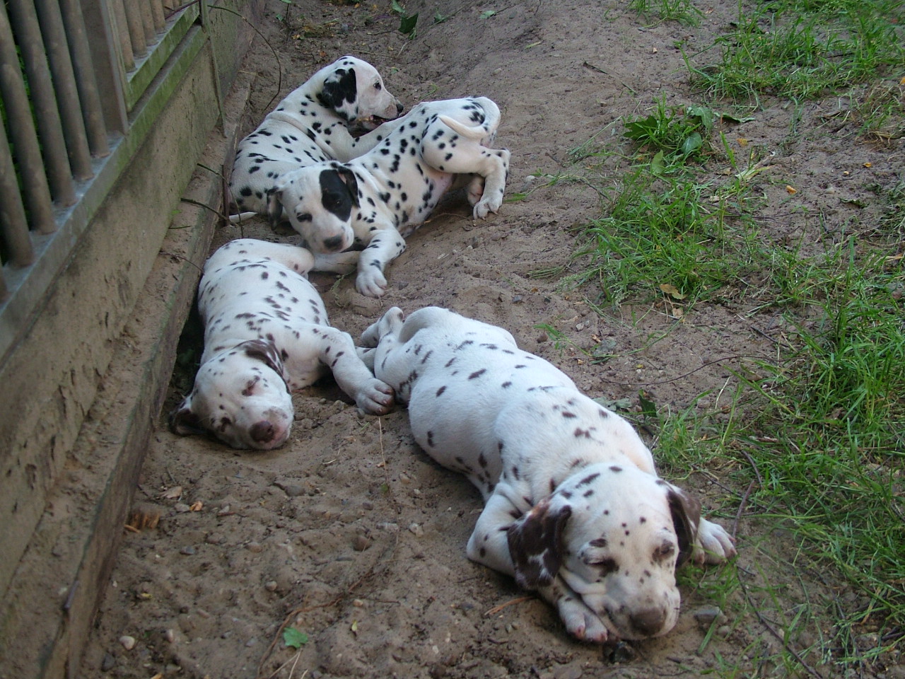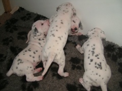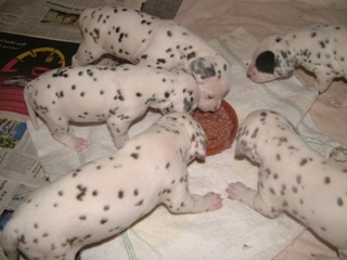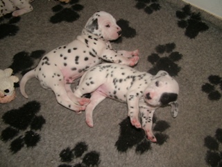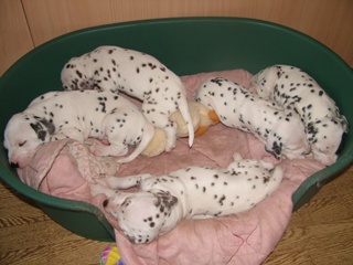 | 1. + 2. und auch die 3. Woche ist schon vorbei! Wir haben viel Neues gelernt und unser kleines Reich ist vergrößert worden. Nun sind wir nicht mehr nur in der Wurfkiste, sondern im Auslauf innerhalb der Veranda, und dort können wir schön laufen und spielen. Wir gehen schon auf die „Toilette“ (Zeitungspapier - was aber nicht immer zu 100% „getroffen“ wird), bekommen auch 3x Welpenfutter, aber bei Mama „Penny“ schmeckt es immer noch am besten und ist sooo bequem. Unsere Schlafzeiten werden länger und danach spielen wir auch miteinander. Jetzt sehen wir wie Mini-Dalmatiner aus und machen uns schon mal lauthals bemerkbar, wenn uns etwas nicht gefällt. In der kommenden Woche erwarten wir die ersten Besucher. |