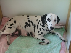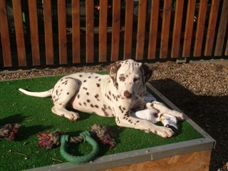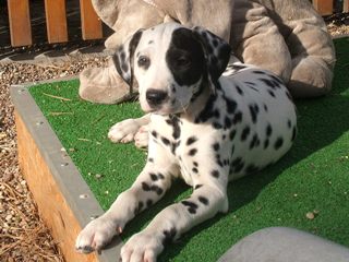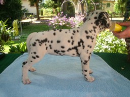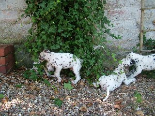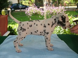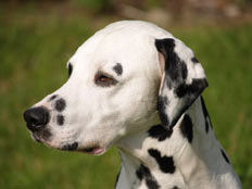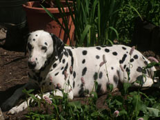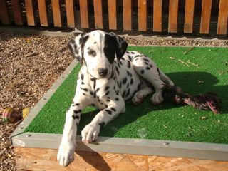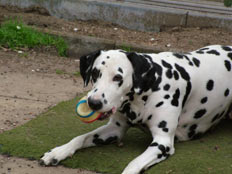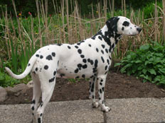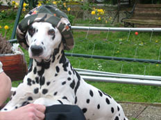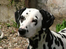 ist unsere „Piratenbraut“ (Kopfplatte) - etwas Besonderes und ganz Liebenswertes. Sie ist sehr schön gleichmäßig weiß-schwarz getupft, eine kleine temperamentvolle Hündin mit einem großen Bedarf an Zuwendung, freundlich und zutraulich. |