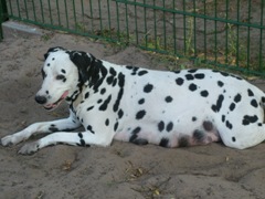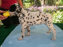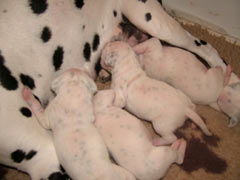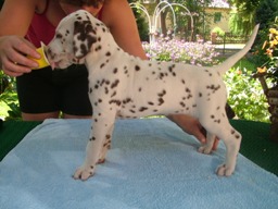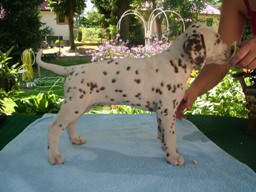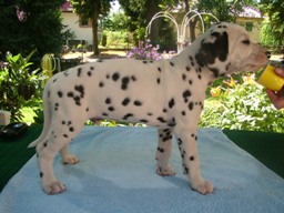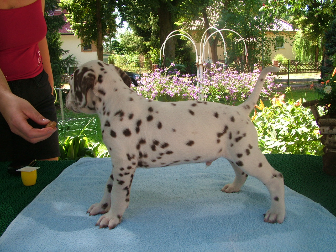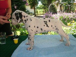 | Nun sind schon 4 Wochen vergangen und unser kleines „Welpenrudel“ tummelt sich in seinem Reich (unsere Veranda) und es vergehen viele Stunden der Beschäftigung mit den Kleinen, des Saubermachens und des Füttern (Welpenfutter lässt sich so wunderschön „verteilen“). Mama „Penny“ wartet ganz ungeduldig auf die Welpenfutterreste. Beim Spielen merkt man nun schon die kleinen, spitzen Zähnchen, was auch Mama „Penny“ zu spüren bekommt. Sie ist super fürsorglich mit den Welpen und noch immer trinken die kleinen „Racker“ lieber bei Mama, als sich über die leckere Welpenmahlzeit herzumachen. Der Wurf ist sehr ruhig und ausgeglichen, was nicht nur an der Welpenanzahl liegt, alle haben eine schöne gleichmäßige Tüpfelung und ein ganz kräftiges Pigment. Unsere beiden Jungs haben sich schon ihre zukünftigen Besitzer „erobert“. Die 3 „flotten“ Mädels sind noch auf der Suche. In der kommenden Woche gibt es Einzelvorstellungen! |