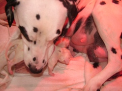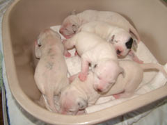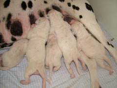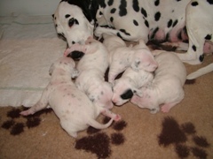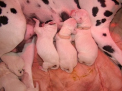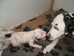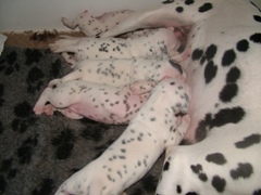 | Nun ist bereits eine Woche vorbei, die kleinen „Racker“ haben die meiste Zeit mit trinken, schlafen, schon emsig durch die Wurfkiste robben und auch mit etwas „Musik“ verbracht. Bei allen Welpen waren die Nabelschnüre am 2. Tag abgetrocknet. Das Geburtsgewicht hat sich verdoppelt und da sie eifrig am trinken sind, ist es bei einigen der kleinen Wonneproppen sogar mehr. Nun kommt auch schon die Fleckung etwas durch und wir freuen uns auf die nächsten Tage. Unsere „Penny“ nimmt alles gelassen, ist eine ganz liebe Mama und kommt nun auch von alleine aus der Wurfkiste um ihre „Geschäfte“ zu erledigen. |