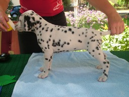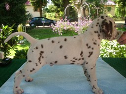 ist eine wunderschöne, elegante, weiß-schwarze Hündin mit einer gleichmäßigen Fleckverteilung. Sie ist temperamentvoll, unerschrocken, möchte viele Streicheleinheiten und hat mit ihrem „einseitig hörend“ absolut kein Problem. Für ihre zukünftigen Besitzer wird sie ein toller Familienhund sein. |